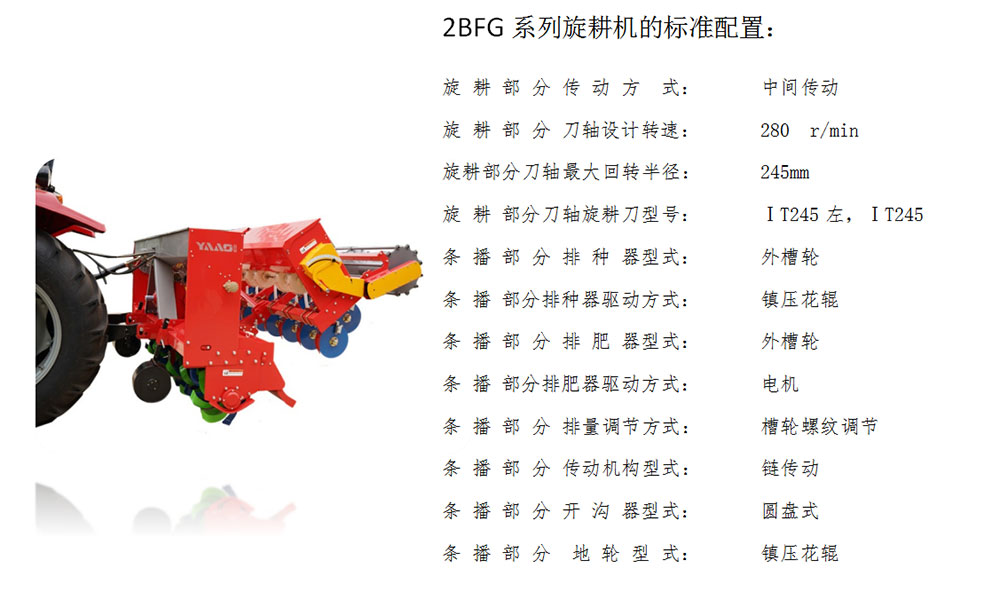 旋耕施肥播種機(jī)是一款多功能農(nóng)業(yè)機(jī)械設(shè)備,它集旋耕、施肥、播種、覆土、鎮(zhèn)壓于一體,一次作業(yè)可完成多項(xiàng)任務(wù),減少機(jī)械進(jìn)地次數(shù),節(jié)約成本。微電腦電機(jī)控制施肥,無級調(diào)速,專用設(shè)計(jì)不銹鋼導(dǎo)肥槽,保證撒肥面積均勻,鎮(zhèn)壓輥后驅(qū)動,增加防滑裝置,保證播種質(zhì)量,配套圓盤開溝器,保證種子落地準(zhǔn)確,防止纏草,一機(jī)多用,經(jīng)過調(diào)整可以切換為花生平播或壟播,小麥、旱稻、油菜、高梁平播等多種狀態(tài)。主要功能如下: