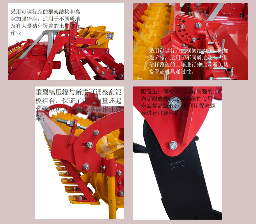 6、深松單元采用鑿型鏟翼式結(jié)構(gòu)組合,單鏟幅寬可達26厘米,深度可達33厘米。翼鏟高度可調(diào),可滿足不同耕作需求;