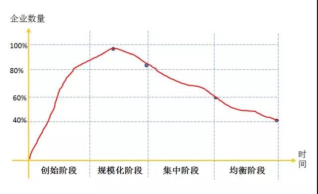 在一個行業(yè),從長期看,企業(yè)要存活下來就要有超出平均水平的成本控制能力。管理學(xué)家陳春花認(rèn)為一個行業(yè)內(nèi)企業(yè)數(shù)量和時間軸之間的關(guān)系可以通過四個發(fā)展階段來說明:初創(chuàng)階段、規(guī)模化階段企業(yè)數(shù)量一直上升,規(guī)?;笃谄髽I(yè)數(shù)量達到頂峰,開始有擠出效應(yīng),約20%企業(yè)出局,到集中階段又有20%企業(yè)出局,到均衡階段還要淘汰20%,最后的競爭就在剩下的40%企業(yè)之間展開。